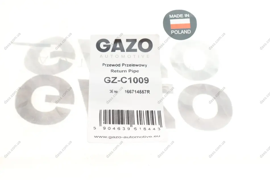 Gazo - бренд який є провідним виробником автомобільних запчастин у Польщі. Компанія виробляє деталі двигуна для систем упорскування CR (Common Rail), такі як: паливопроводи, перепускні шланги, прокладки, підкладки, а також комплекти для збирання та ремонту легкових автомобілів та автофургонів – поточна виробнича програма постійно розширюється. Багаторічний досвід продажу та знання двигунів внутрішнього згоряння дозволили швидко адаптувати продукцію до потреб ринку.