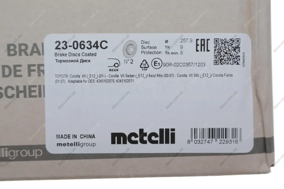 Диск гальмівний (задній) Toyota Corolla 02-13 (258x9) (з покриттям) (повний) Metelli 230634C