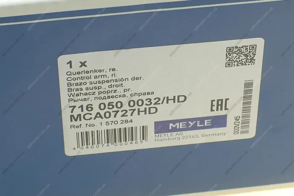 Meyle– відомий німецький бренд. Компанія була заснована в 1958 році, більш ніж за 60 років фірма пройшла шлях від простого експортера деталей до великої компанії зі своїми виробничими потужностями. Основне виробництво зосереджено у Китаї. Все робиться на німецькому устаткуванні під контролем німецьких інженерів. Головний офіс компанії знаходиться у місті Гамбург (Німеччина). Основний асортимент Meyle – деталі для Європейських марок авто: втулки, сайлентблоки, підшипники, стійки стабілізатора, амортизатори, демпфери, важелі, насоси, елементи кермового керування, деталі зчеплення. Преміум лінійка продукції cіндексом – HD(hard drive) позиціонується як відповідна якості оригіналу.